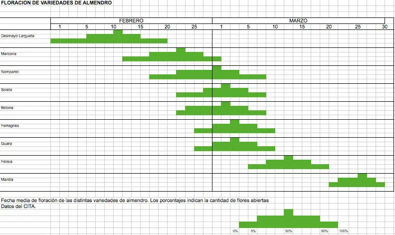 Comparativa de épocas de floración. El Almendro Mardía asegura la cosecha en climas fríos. Haz clic para ampliar.